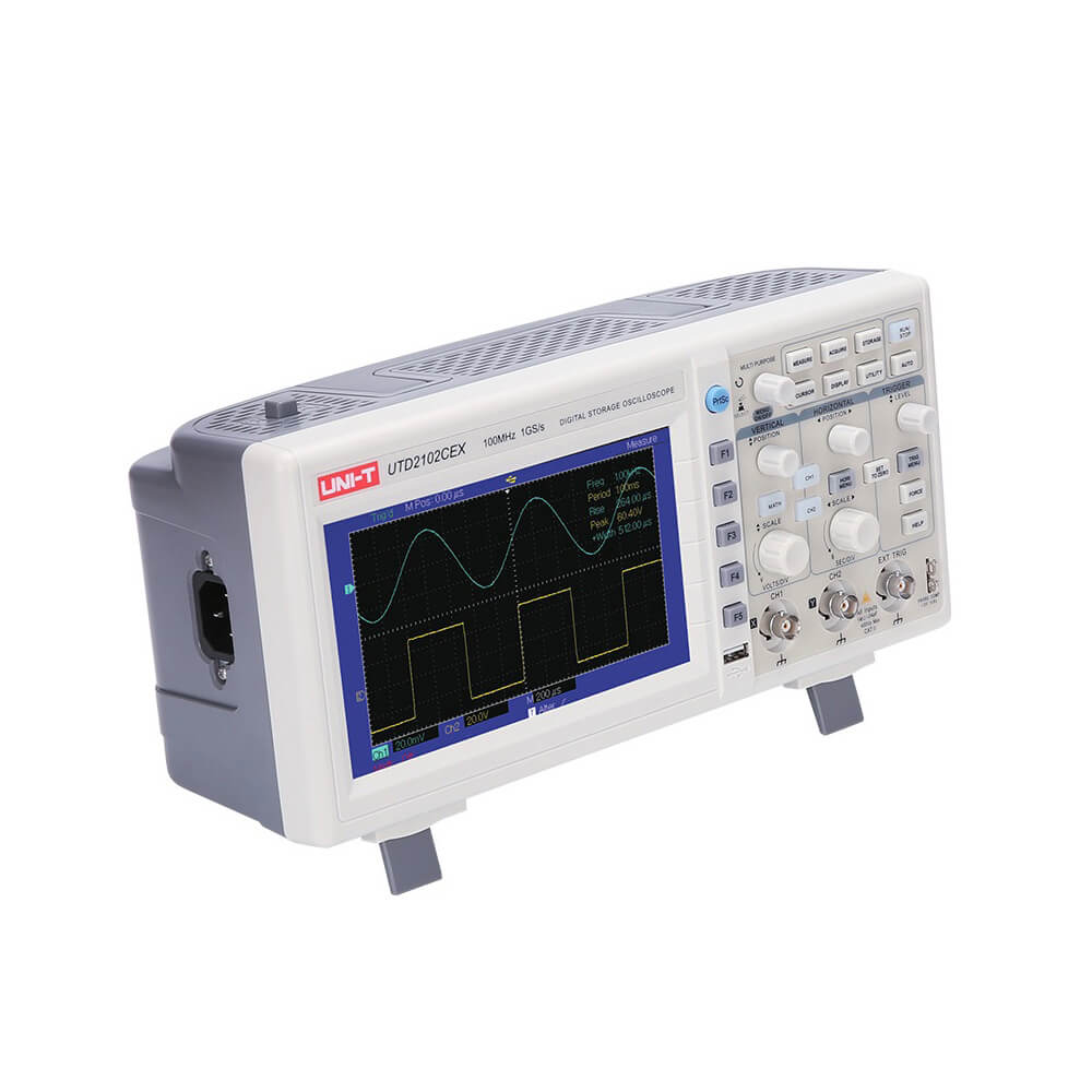UTB2102CEX — настольный двухканальный цифровой осциллограф с полосой пропускания 100 МГц, частотой дискретизации 1 Гвыб/с и временем нарастания сигнала менее 3,5 нс. Осциллограф оснащен большим цветным LCD дисплеем с диагональю 7″ и разрешением 800 × 480 пикселей.